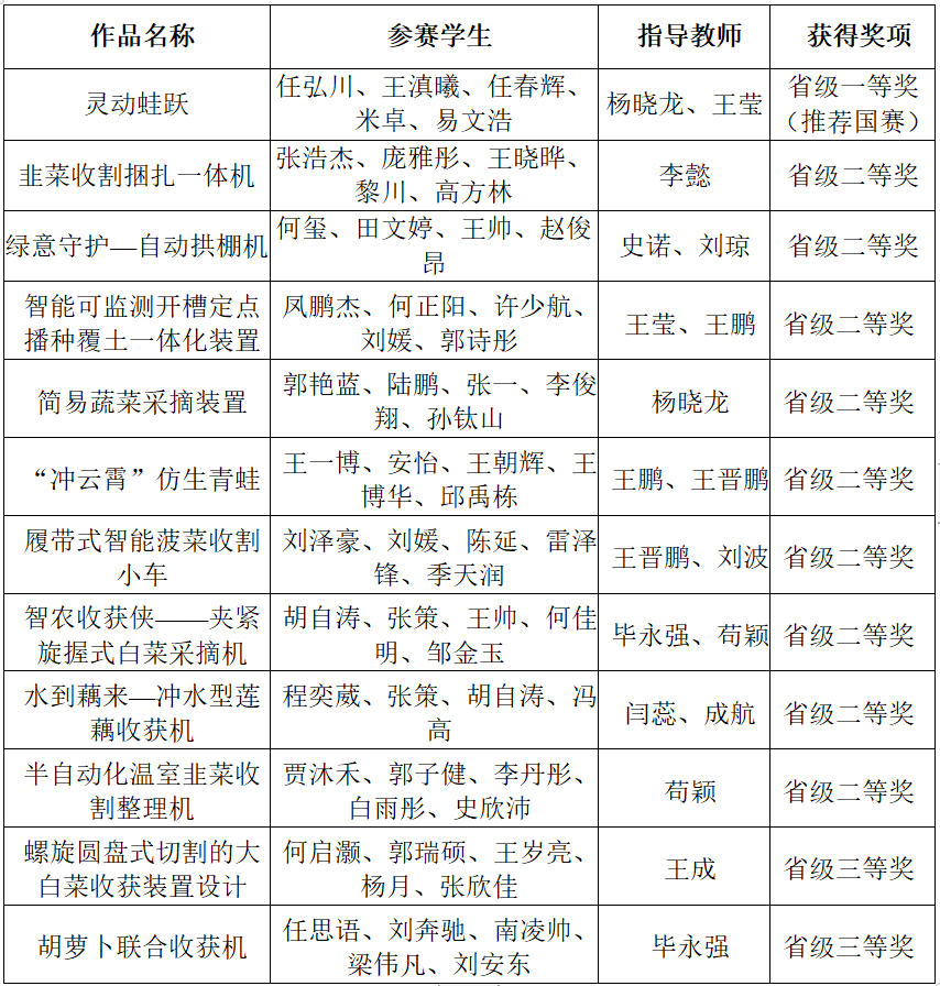 最终,经过5月11日、12日的多轮汇报、实物演示和现场问辩,在各参赛队伍的奋力拼搏下,我校取得了一等奖1项,二等奖9项,三等奖2项的好成绩,其中“高性能仿生机械”作品“灵动蛙跃”在省赛中名次位列第8,被推荐进入国赛,在这项赛事上实现了历史性的突破。具体获奖名单如下: