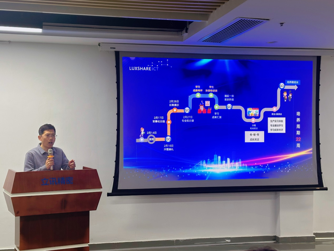 产业学院讲师代表陈永富老师强调了理论与实践相结合的重要性,他为学生们精心规划了一条从军事化训练到专业知识学习,再到学习成果汇报的清晰培养路线图,旨在帮助学生们更好地规划学习路径,实现个人价值的最大化。
