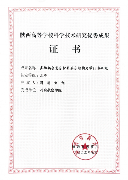 陕西高等学校科学技术研究优秀成果奖三等奖团队成员为闫蕊、刘旭老师。该奖由陕西省教育厅授予、该奖项是对省内高校优秀科学技术研究成果的官方认可。项目团队于2025年7月获得该奖项,成果名称为“多场耦合复合材料层合结构力学行为研究”。复合材料因其超越传统材料的卓越的力学特性而备受瞩目,在航空、航天、油气田、柔性电子等领域均有广泛应用。项目主要工作包括针对复合材料层合结构应力分析多为力、热单一载荷问题,建立了热力耦合下界面切应力的理论模型。实现了复合材料板高速冲击SPH 模拟的GPU 并行计算。共发表相关SCI论文5篇,发明专利2项。获得1项国家自然科学基金,2项陕西省自然科学基金的支持。