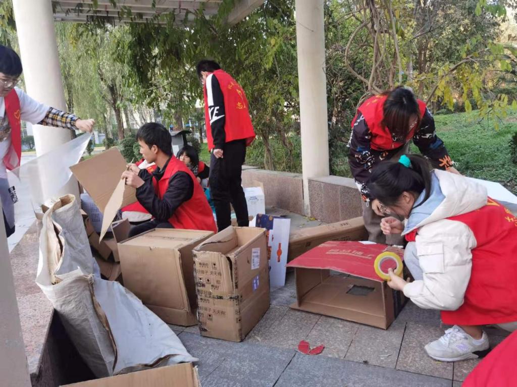我院青年志愿者中队提前一周开始策划以及准备所需材料,最终选用了易得且保暖的纸箱、泡沫板废旧衣物,准备了颜料,剪刀,胶带等工具,为搭建猫窝做足做全做好准备。