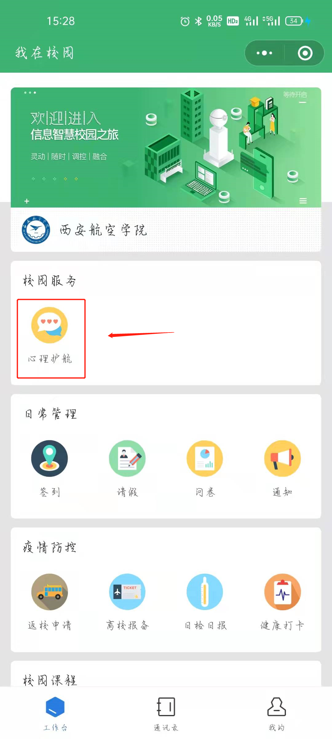打开 “我在校园”,点击 “心理护航”模块,按提示步骤进行预约。