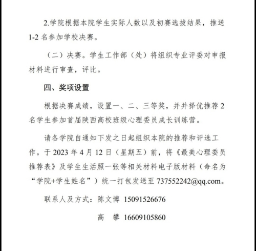 为加强四级预警防控体系末端力量建设,进一步增强班级心理委员识别心理危机、协助危机处理、朋辈心理帮扶的意识与能力。我校组织开展“我最喜爱的心理委员”评选活动。2020-2023级在任的班级心理委员可以积极报名参加此次活动,丰富大学生活,增加自己的阅历,可以与他人互相学习来提升个人素质,还有机会参加首届陕西高校班级心理委员成长训练营,可以与其他高校学生交流互鉴,开阔视野,使自己变得更加优秀。
