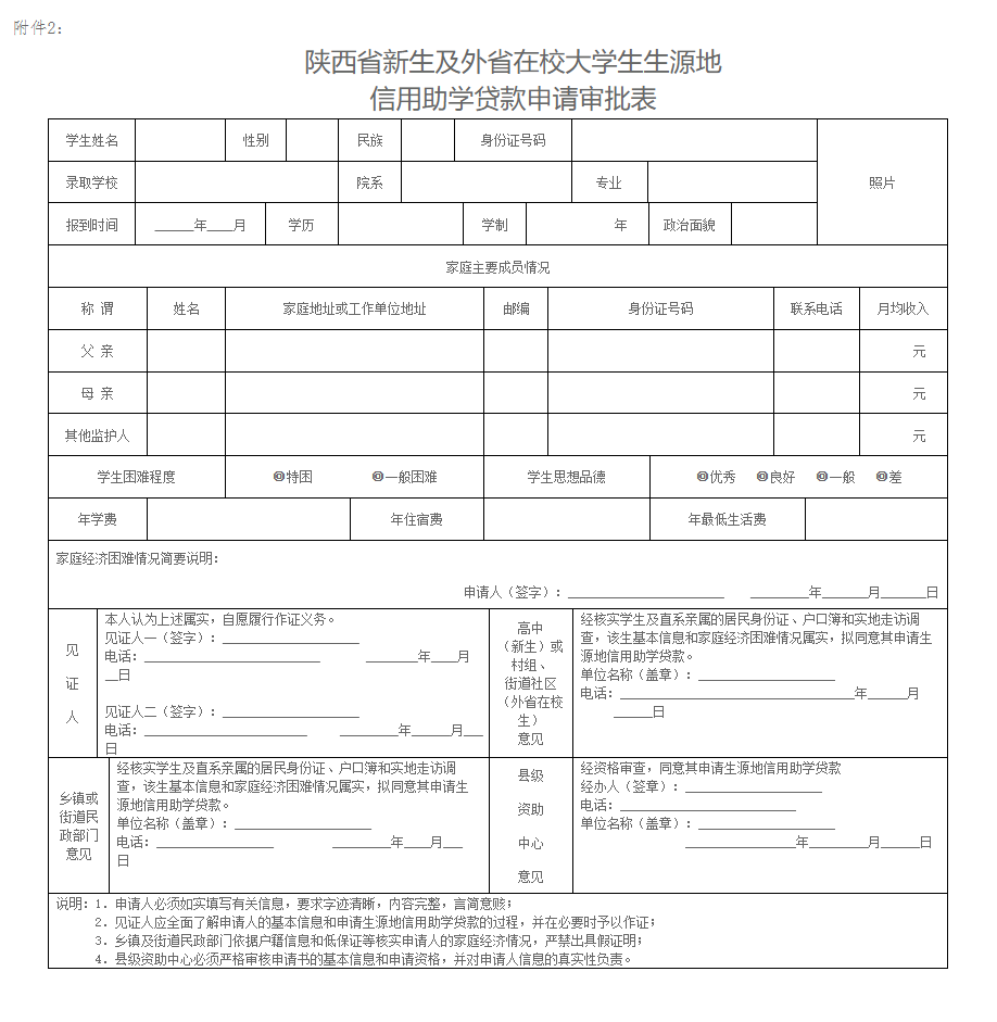 2.陕西省新生及外省在校大学生生源地信用助学贷款申请审批表
